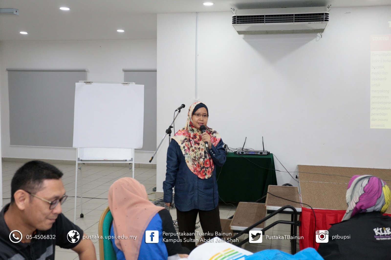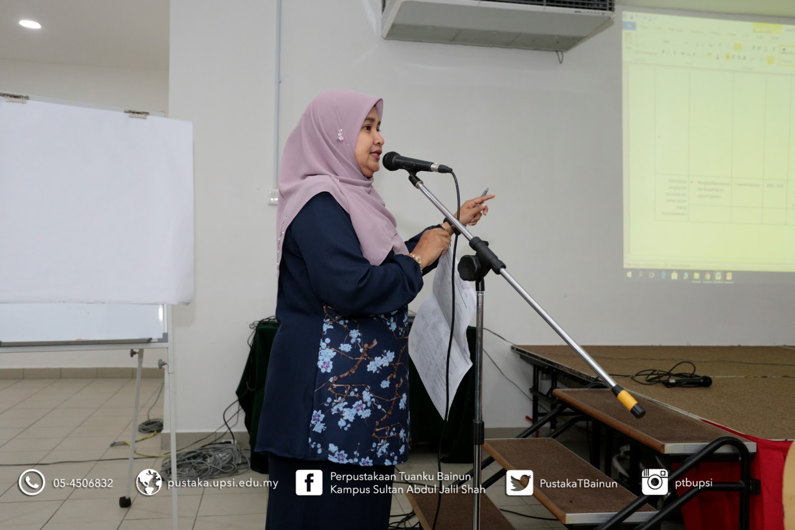 | Pembentangan oleh Timbalan Ketua Pustakawan Kanan, Puan Siti Sumaizan Ramli. |