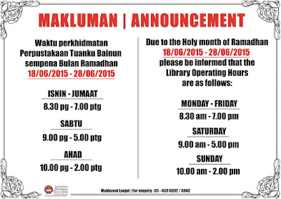 berita@pustaka : Waktu perkhidmatan Perpustakaan Tuanku Bainun