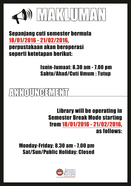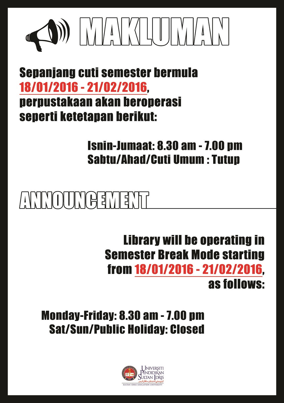 • Waktu Operasi Perpustakaan Sempena Cuti Semester / Library Operating Hours During Semester BreakWaktu Operasi Perpustakaan Sempena Cuti Semester / Library Operating Hours During Semester Break