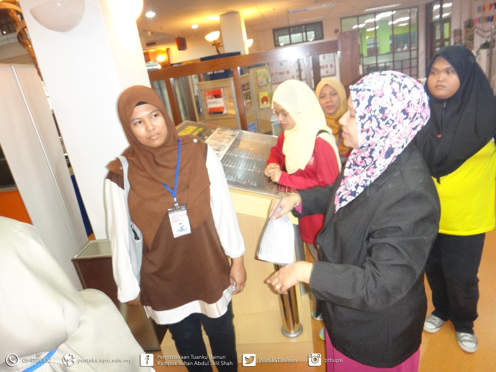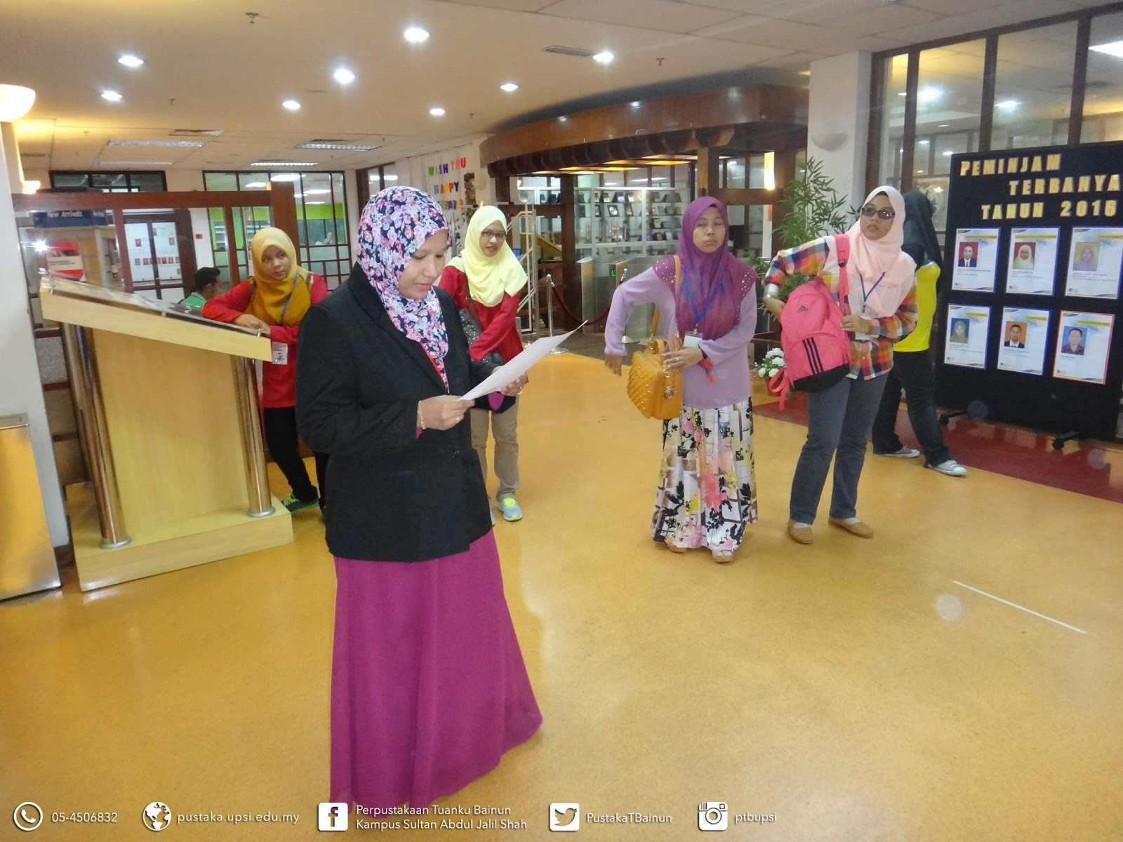 Exco Majlis mahasiswa Kediaman Luar Kampus UPSI yang mengendalikan lawatan berpandu sekitar perpustakaan |