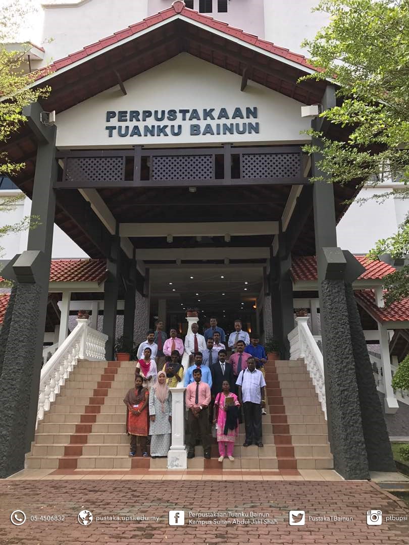 8 Mei 2017 — Perpustakaan Tuanku Bainun telah menerima lawatan dari Tamil University, Thanjavur, India. Delegasi ini datang ke Universiti Pendidikan Sultan Idris untuk menandatangani MoA antara kedua universiti dan dikesempatan ini mereka berminat untuk melawat sekitar perpustakaan. Lawatan terdiri daripada 19 orang dan dibawa oleh Prof. Madya Dr. Samikkanu Jabamoney dari Fakulti Bahasa dan Komunikasi. Lawatan sampai ke perpustakaan pada jam 9.45 pagi.