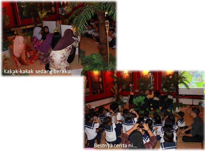 Tepat 9.50 pagi, kedengaran suara kanak-kanak comel ini berteriak keriangan menaiki tangga perpustakaan. Kanak-kanak ini seterusnya dijemput mengambil tempat di hadapan pentas boneka. Program dimulakan dengan nyanyian lagu ‘Kalau anda gembira’ beramai-ramai oleh kanak-kanak, kakak-kakak AJK dan guru-guru. Selesai sesi nyanyian, persembahan boneka dimulakan. Semua kanak-kanak yang hadir bersorak apabila diperkenalkan dengan watak-watak boneka yang comel. Kanak-kanak mula memberi perhatian apabila cerita dimulakan. Cerita yang dipersembahkan berkisar tentang perlumbaan di antara kura-kura, badak dan harimau di mana akhirnya kura-kura menjadi johan.