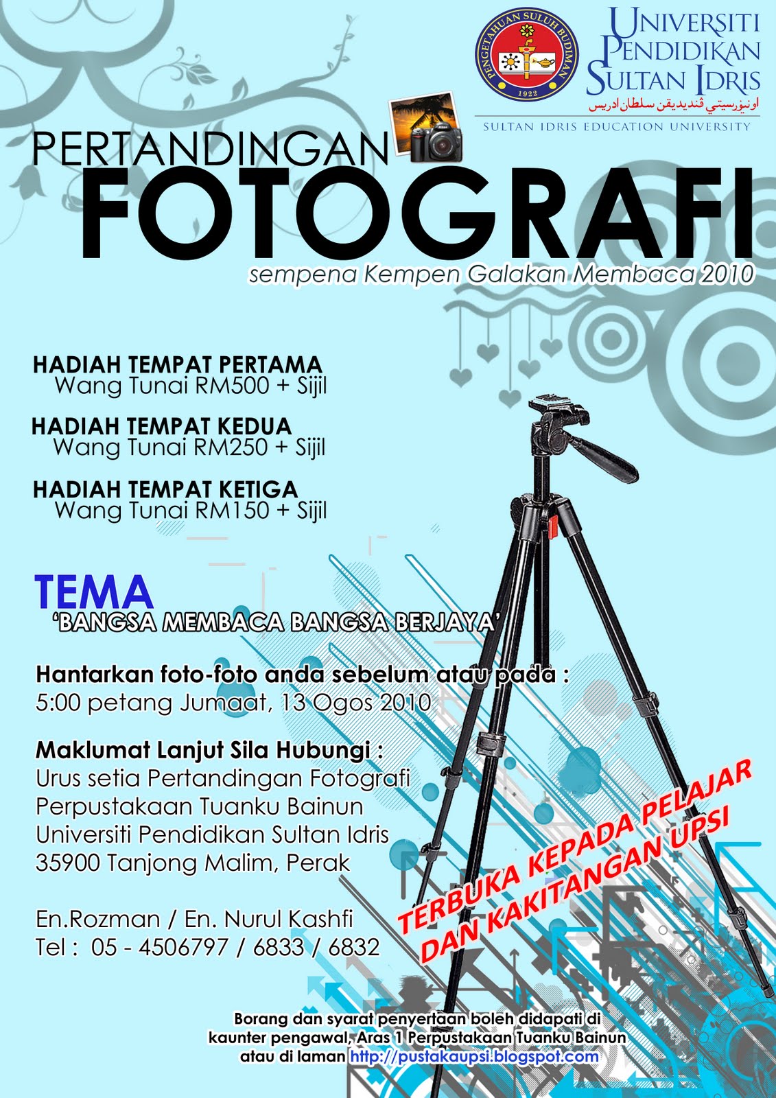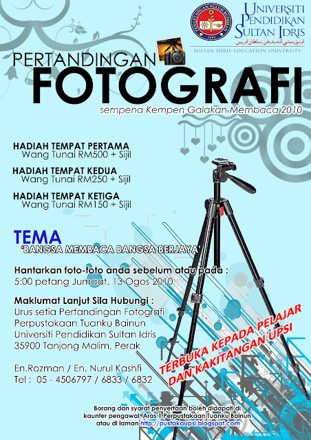 Bersempena dengan Kempen Galakan Membaca 2010, Perpustakaan Tuanku Bainun akan menganjurkan Pertandingan Fotografi bertemakan ‘Bangsa Membaca Bangsa Berjaya’.