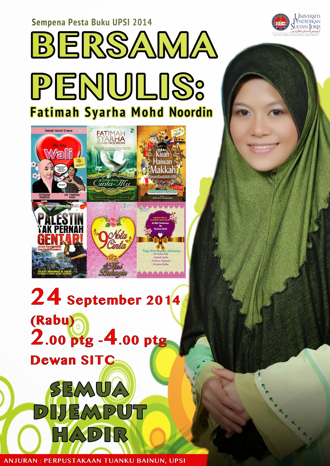 Jom meriahkan Program Bersama Penulis : Fatimah Syarha Mohd Noordin, novelis terkenal pada Rabu 24 September 2014 bermula jam 2.00 petang bertempat di Dewan SITC, UPSI bersempena dengan Pesta Buku UPSI 2014. Jumpa anda disana.